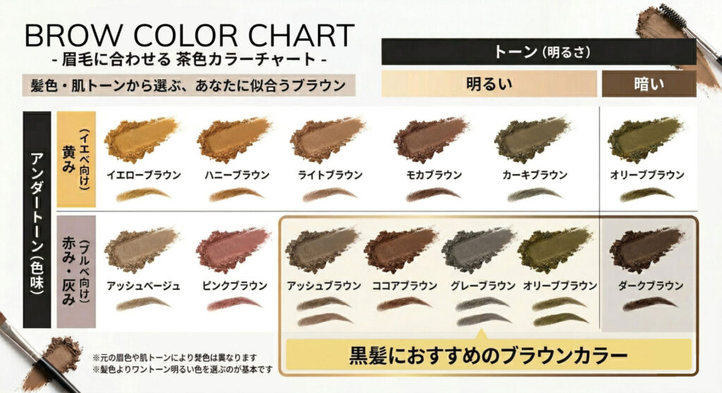黒髪に対して明るすぎるイエローブラウンやオレンジブラウンを使うと、髪色とのコントラストが強すぎて眉毛だけが悪目立ちしてしまいます。これが、浮いて見える原因です。黒髪に合わせる場合は、赤みや黄みを抑えた無彩色に近いブラウンを選ぶと、自然な仕上がりになります。