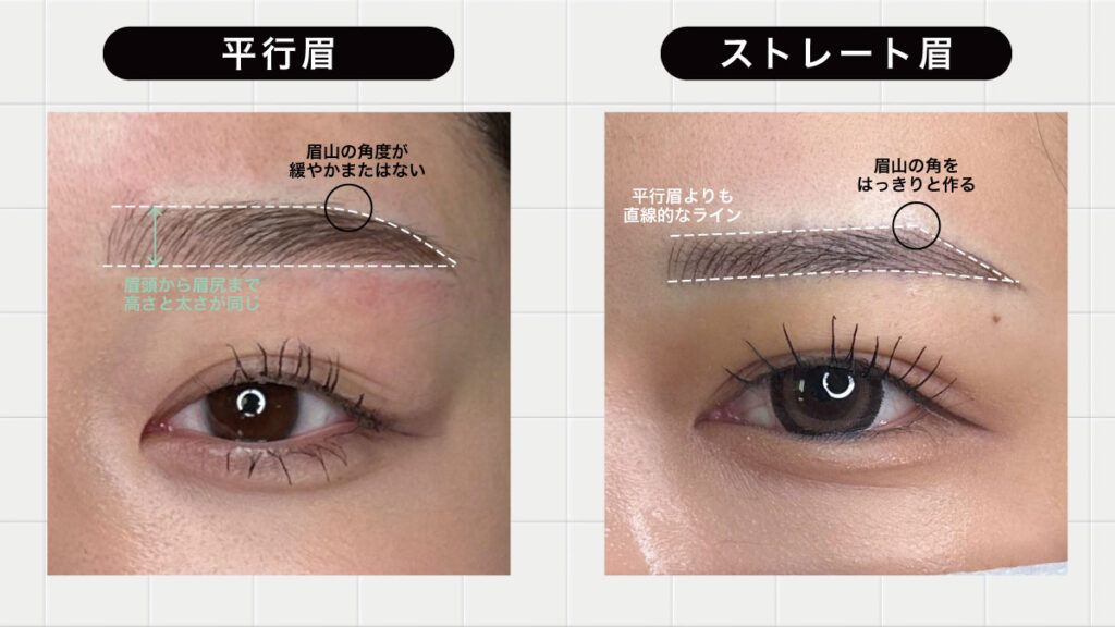 直線的な眉毛というとストレート眉を思い浮かべる方もいらっしゃるかもしれません。ストレート眉と平行眉は似ていますが、実は少し違いがあります。ストレート眉は直線的でありながらも斜め上に向かって角度がついているデザインを指し、クールでシャープな知的な印象を与えます。一方で平行眉は、地面に対してほぼ水平なラインを描くため、より優しげで柔らかい雰囲気を引き出してくれるのが特徴です。ご自身のなりたい雰囲気に合わせて選んでみてくださいね。